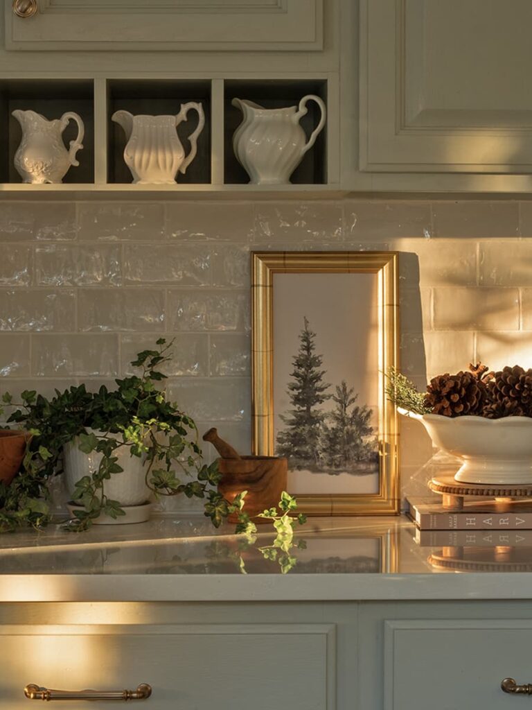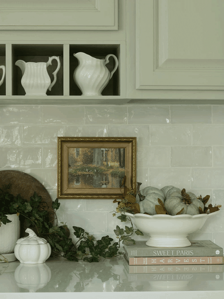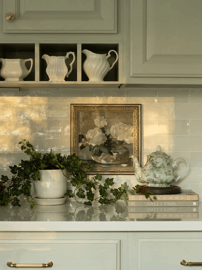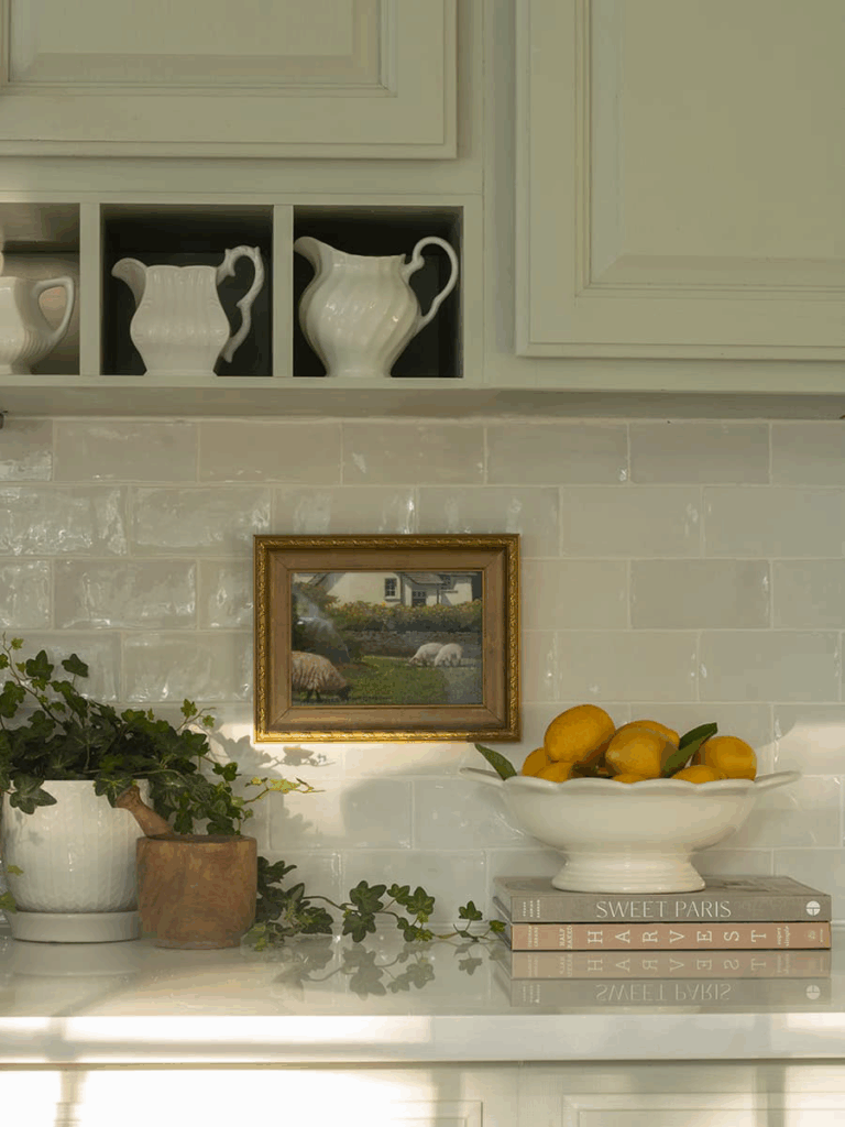 Landscapes, florals and botanicals are prevalent in English country style. If you don’t have wall space in your kitchen (I have very little), add artowork to your backsplash. I rotate small prints in vintage frames with the seasons.