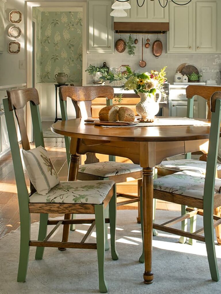 My kitchen window is topped with a valance made from fabric that features leafy vines. While more colorful floral fabrics can be featured in English kitchens, I prefer to keep the backdrop a bit more neutral. My kitchen chair seats are covered in a green and brown floral fabric, and I rotate a variety of tea towels in colorful patterns.