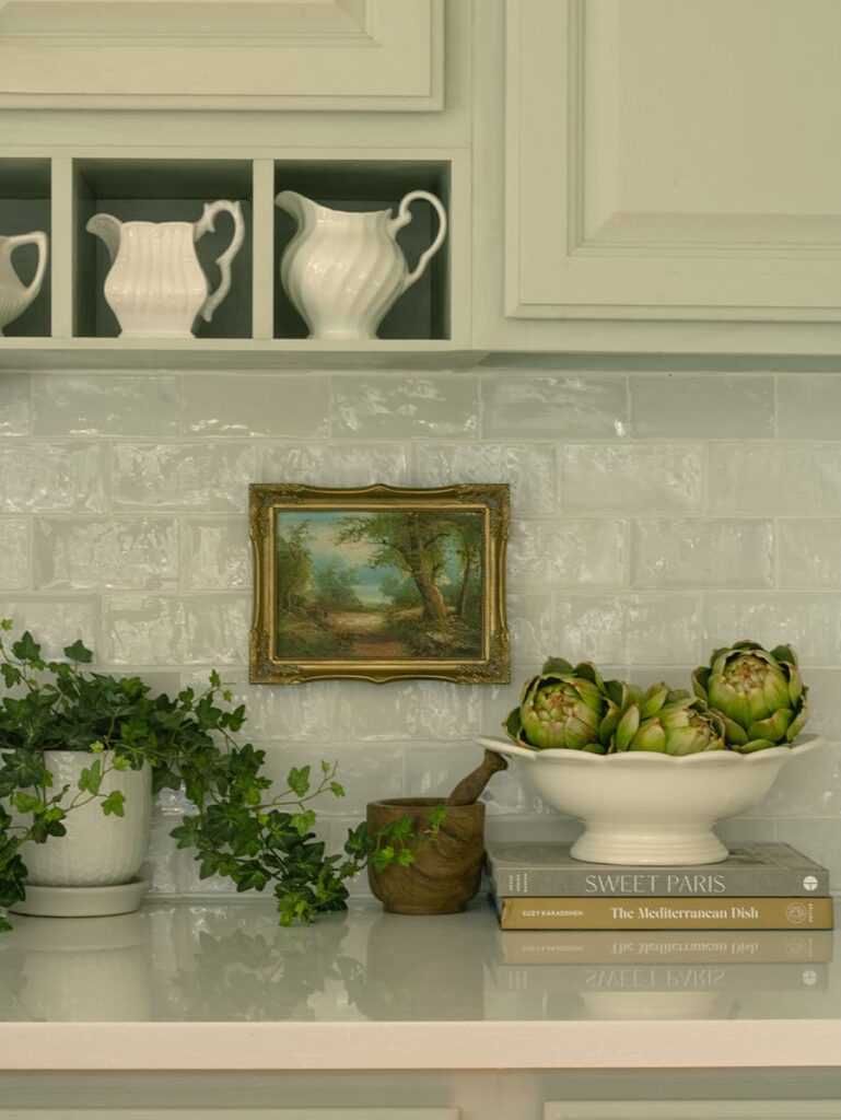 I know, I know, most people look up recipes online, but I love cookbooks. Truth be told, I just love books and use them as decor in every room of my house. Cookbooks add beautiful layers to a kitchen counter. I stack them to act as a base for a bowl of fruit or seasonal decor. They also stand on end in a corner of my long kitchen counter.