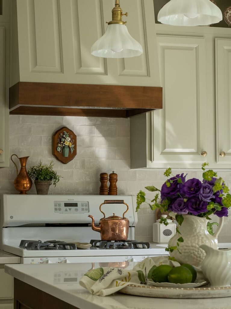 Before we updated our countertops, we installed a backsplash that changed the whole look of our kitchen. Without changing anything else, the backsplash made a big difference. In our most recent update, we installed new countertops and a new backsplash that is more in keeping with the English country style. I chose zellige tiles in a handmade look that adds to the English country aesthetic. Brick, stone or terrracotta tiles would also be the perfect backdrop for this style.